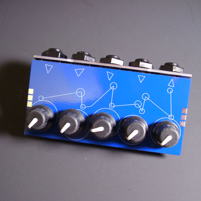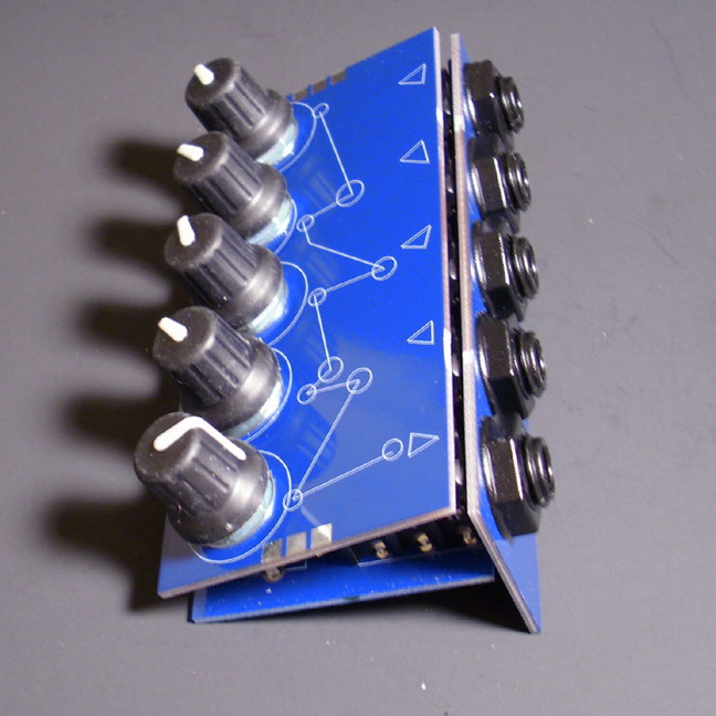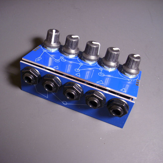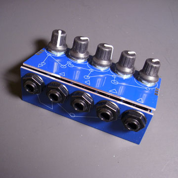 this is a compact four channel passive analog mono mixer with volume controls for each channel along with a master volume control. it can be used to process either audio or control voltages and it can be used backwards as a splitter.